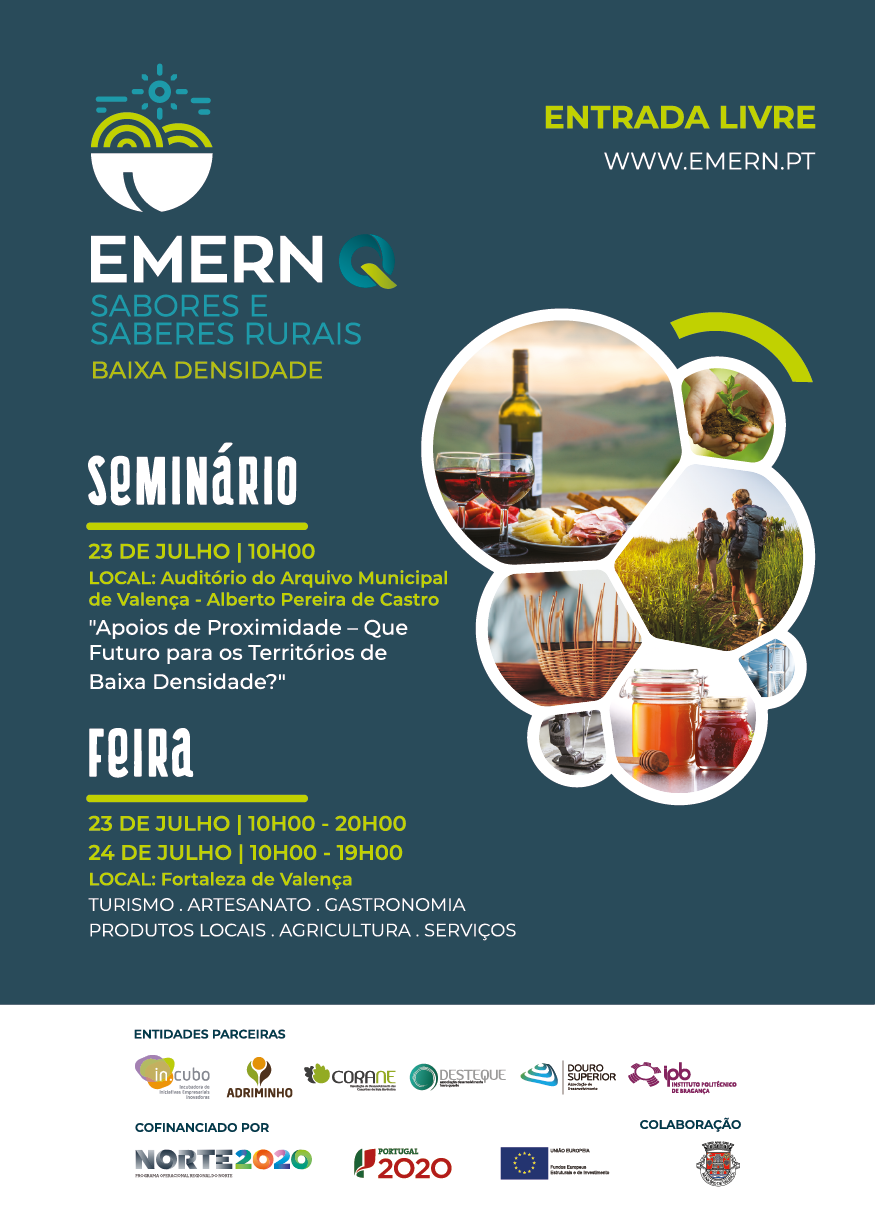 O Evento “EMERN-Q – Sabores e Saberes Rurais da Baixa Densidade ” é realizada pelos promotores do Projeto “EMERN-Q Baixa Densidade – Qualificação de Micro e Pequenos Negócios” onde estarão presentes, com as suas empresas, cerca de 50 empreendedores. Este projeto tem como missão desenvolver estratégias coletivas de qualificação de micro, pequenas e médias empresas em toda a região Norte, tendo como beneficiárias IN.CUBO – Incubadora de Iniciativas Empresariais Inovadoras, DESTEQUE – Associação para o Desenvolvimento da Terra Quente, DOURO SUPERIOR – Associação de Desenvolvimento, ADRIMINHO-Associação de Desenvolvimento Rural Integrado do Vale do Minho, CORANE – Associação de Desenvolvimento dos Concelhos da Raia Nordestina, IPB – Instituto Politécnico de Bragança, o desenvolvimento e incremento do projeto contou ainda com o apoio da Comissão de Coordenação e Desenvolvimento Regional do Norte (CCDR-N) e do Programa Comunitário Norte2020.